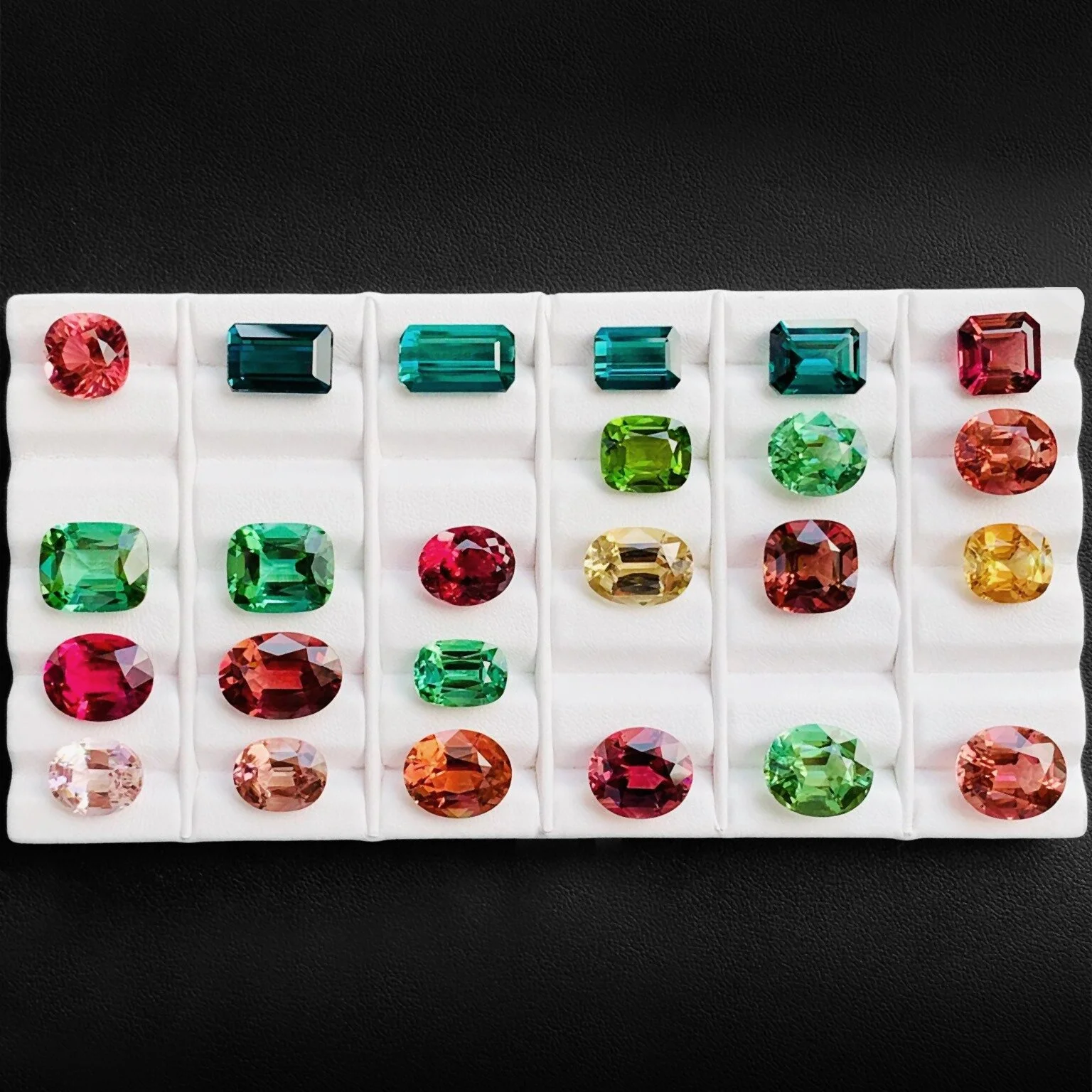 Some stock gems from left to right is sphene, tanzanite, spinel (grey), zircon, sapphire (purple) & tourmaline (raspberry).